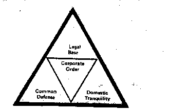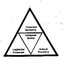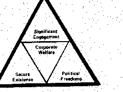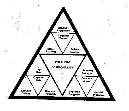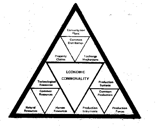 1. This compend is an analysis of dynamical processes, imbalances, ideologies, and contradictions in the economic, political, and cultural arenas of society. The triangular schematization of society is made not on the basis of structures or institutions or the myriad of social groupings, but on the basis of process. A process may be imagined as a whirling flow of interacting social "going onnesses," dynamic, not static. The diagrammatic triangulation of society allows all social processes to be located relationally and hierarchically. Relationally, the three poles of the triangle are, on the bottom left, the foundational pole; on the bottom right, the communal pole; and, at the apex, the rational pole. The foundational is the sine qua non-that without which the others could not be sustained in being. The communal pole has to do with societal structuring. The rational pole gives meaning to the rest, illuminating the whole humanizing process. Between these poles are sets of whirring dynamics which swirl back and forth in a great ebb and flow of interactions which create, limit and sustain. In other words, these triangles are the framework for a dynamical sociology.