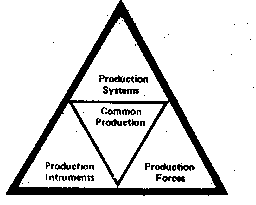 North American Indian tribes cultivated corn using specially sharpened planting sticks and wooden hoes. Only part of the tribe cultivated the corn, however, and within this group specialized tasks were performed by the young children and the old women. When white men first arrived in New England, Indian corn cultivation was the production system which guaranteed their survival as a colony. But common production does not exist in a social vacuum. Rather, it constantly demands raw materials, thereby sustaining common resources, and it defines the quantity and quality of finished goods, thereby limiting distribution possibilities. It is the production of textiles, for example which maintains the Egyptian cotton growing industry and plays a large part in determining which particular fabrics will be used to make clothes in Latin America. Further, in the popular mind, production is virtually equivalent to the whole economic process, even though its purpose is not complete until the usable products it has created have been distributed.
