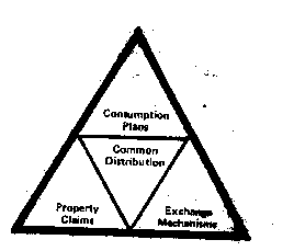 19 The tyranny of property claims may be seen also in the fact that many cultural facilities are operated as moneymaking ventures insteadof being publicly underwritten as crucial functions of society. Such has been the situation with public parks in many states, and with a number of major symphony orchestras. Exchange mechanisms the process by which goods and services are kept in motion throughout a society7 is the ally pole, controlled by the power of property claims. Its impotence is manifest in the fact that the values set on services, goods and credit are determined by ownership claims which are in large measure unresponsive to social need. This can be seen in the imposition of tariffs on foreign cars when they seemed to be taking a large share of the automotive market away from domestic manufacturers. The tariffs seemed to take no account of the comprehensive picture of transportation needs or of the desires of buyers for less expensive cars. The consumption plans process is the collapsed pole in distribution in that local man has no effective voice in determining how goods and services are to be distributed unless he can demonstrate his power BY the amount of property he owns or controls" This collapse has been demonstrated in the foreign car import situation, where the decision to impose a tariff was made by the economically powerful.