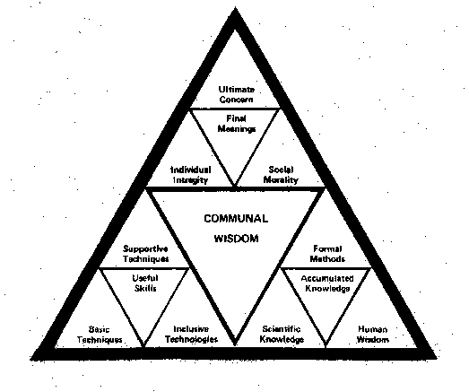 2. In the document that follows it is to be observed that there are five sections-one for each of the "arenas" referred to above-each approximately ten pages in length. Within each of these, the analysis goes one level deeper. That is, the paragraphs guide the reader around the three major poles of the process in question, beginning at the lower left (foundational), moving to the right (communal), and ending at the top (rational) pole of the triangle. This "walk" around the triangles occurs four times-once for the whole, and once for each set of triangles at the second level of analysis. Then, again within each section, there is another