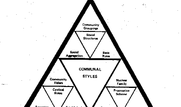 62.Communal style indicates the process of actualizing the life stance of a society as it communicates its collective knowledge for the sake of embodying the significance of its world view. The process includes preserving the various age roles, maintaining covenantal and sexual mores, and shaping organizational forms. Cyclical roles are the dramatization of the varying life stances of a community's members. Procreative schemes embodies the male and female roles, covenantal relationship and societal forms enabling the continuation of the human race. Social structures are the illustrative processes which make a society aware of itself, both as a whole and at every level. For example, in traditional China, a communal style enduring for over two thousand years was built on a clearly defined veneration of the elder generation, with specified familial and communal responsibilities. Thus communal style is the social enactment of a community's world view.