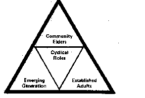 71. Cyclical roles has to do with delineating generational patterns in society. This is distorted by the tyranny of the emerging generation and the collapse of the community elders, which has rendered established adults immobile and in a position to be used by the tyrant. The emerging generation is the tyrant in cyclical roles in that it is allowed to be in charge in the midst of the liberal stance of the established adult and the indifferent stance of the elder. Emerging generation sets patterns of the new in its thinking, style and actions; however, it seldom considers the past. This power is manifest in the way emerging generation was the first to demand a negative stance toward the Vietnam war and has succeeded in transforming world opinion. Established adults is the ally in cyclical roles in that it is officially in charge but depends on the emerging generation for the breakthroughs of the new as opposed to creating its own vision. This impotence is manifest in the established adults deciding their priorities on the basis of the intuitions of the emerging generation. This reveals that the established adults are victims of the new. The community elders have no viable function in a materially prioritized society; thus retirement at 65 concedes that one is useless, and unable to play a key and symbolic role. The effect of this distortion on society is that no role has clarity on its authentic significance as a time of life.