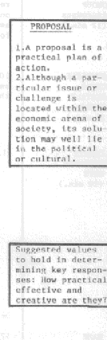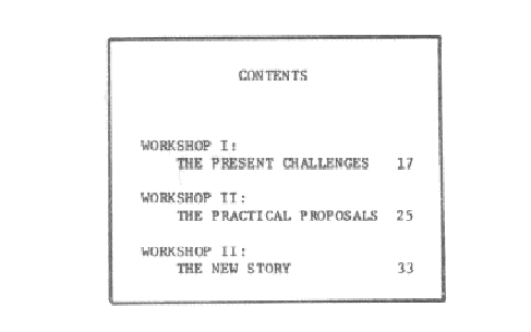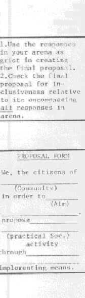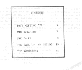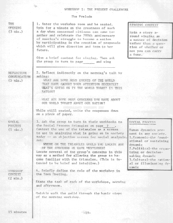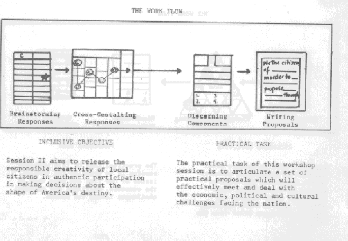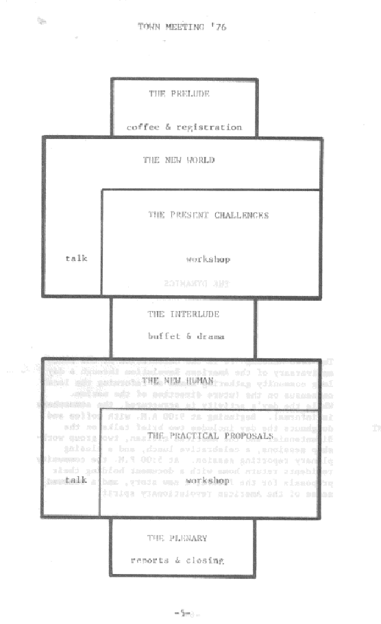 Session five, beginning at 4:00 P.M. concludes the day with a plenary in which the workshop groups report on the day's accomplishments. At 5:00 P.M. the Town Meeting adjourns. Each participant receives a document holding the group's proposals for the future, a new story of the community's role in American history, and a renewed sense of the American revolutionary spirit.