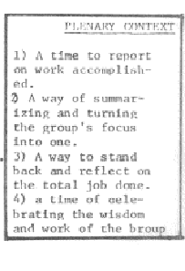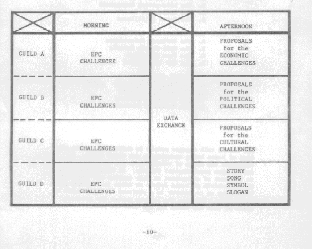 17. This movement needs to be orchestrated so as to allow The group's creativity to emerge and focus into A fine dramatic presentation for the final Town Meeting Plenary. The key is not to be found in mechanically following procedures, but in allowing the guild to focus its time and effort on whatever steps seem most helping.
