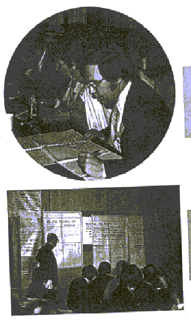 Telling the New StoryIn the first part of the workshop, the guild brainstorms image of the community life and sends the first team off to write a new story for the community.1. Gather as a whole guild and work briefly as individuals. In the spaces provided in your workbook, answer these questions about your community: l) "What have been some of the community's past achievements?" 2) "What are some images of its present struggles?" 3) "What are its dreams of the future?" List at least one answer in each category. Then read your answers aloud while the workshop leader writes them on the wall chart. When everyone has shared his answers, identify the master image or overriding theme which most strongly runs through each list. Write these three master images in your workbook in the spaces provided. One team is assigned to go aside and begin to write, following steps 2, 3 and 4. The rest of the guild moves on to step 5.2. First, as a whole team, look at the three categories of images and add others to it. Then divide into three units, one each to work on the past images. present images and future images. Working individually write one sentence for the assigned topic of your unit on the next page. Now share your sentence aloud with the rest of the unit. Then, working together, weave all the sentences into one unified pc agraph using as many of the images and ideas from the individual sentences as possible. Write it in the space provided.3. When all three units have a paragraph gather as a whole team and listen to them. As a team, discuss possible improvements for each paragraph and ways to unify them into a single story. Now assign three people to polish the story and to write any additional sentences for the para`3raphs. Meanwhile, have the rest of the team select a title for the story. Write this on the next page.4. Now read the final story to the whole team and make last minute revisions to prepare it for publication. Finally, write the story on wall charts for presentation, choose one person to read it aloud to the guild, and submit to the document production typists a copy of the story on the document production form. |