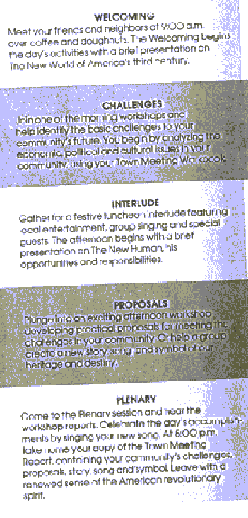 Creating the New SymbolThe remaining team stays to use the images of the tota! guild in creating a new symbol and slogan for the community. This team individually creates sketches of the symbol and then gathers to create a final composite drawing. This symbol will reflect the spirit and purpose of the community and will be presented to the whole Town Meeting at the plenary.9. As a team, review the master images from step 1 and then brainstorm slogans using these images. Select one which could be used by the community as a motto. Now brainstorm possible visual components of the community's symbol suggested by the master images and the slogan. From the total brainstorm list, mark a few which seem most powerful in representing your community's past, present and future.10. Working individually, sketch some symbols. Try to capture the most significant themes artfully. Choose from among your sketches the one you feel is most effective, and draw it on a wall chart.11. Now, as a team, put all the sketches on the wall and look at them until one begins to catch the attention and imagination of the group. Decide on the most exciting and appropriate symbol. Make a list of suggestions on how to refine it, perhaps combining elements from several sketches on the wall.12. Continuing as a team, work out the color scheme, and then assign two members to do the final drawing on the wall chart and also submit to the document production typists a copy of the symbol on the document production" form. While the final drawing is being done, discuss the story that the symbol tells and what might be practical uses for such a community symbol. Assign one person to present the symbol to the guild and then return to the guild meeting space to share your work with the other teams and to prepare for the plenary. |