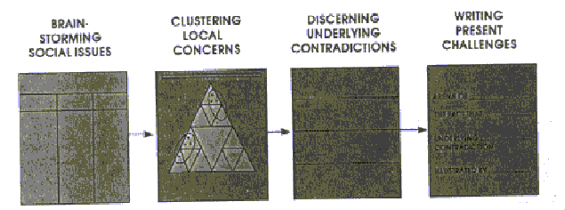 Writing the Present ChallengeIn the fourth part of the workshop, the guild, working in teams and units, writes up the discussion of underlying contradictions for use in the afternoon session. Each team writes a sentence for its assigned cluster which states the present challenge to the community in creating its future.13. Now the team will divide into units of at least three people each. Review your notes on page 17 with the other members of your unit. Then summarize the team discussion in three short phrases on the next page. In these you will be describing the social blocks, the underlying contradiction. and the local illustrations.14. Next, as units, write a short sentence on the next page describing each of these three elements. Each sentence should be 10 to 25 words long. One sentence will describe the social blocks, another sentence the underlying contradiction. and a third the local illustrations of that contradiction.15. Gather as a team and read the sentences aloud. Note their points of similarity and difference and select the best phrases for each of the three parts of the final challenge statement. Create a title by using a three word phrase describing the contradiction. Write it in the box on the next page.16. Then appoint three team members to write the final one-sentence statement. To do this put the phrases selected in Step 15 into the challenge statement form. Then read the statement as a team for final corrections. Copy it on the wall chart and on the document production form. |