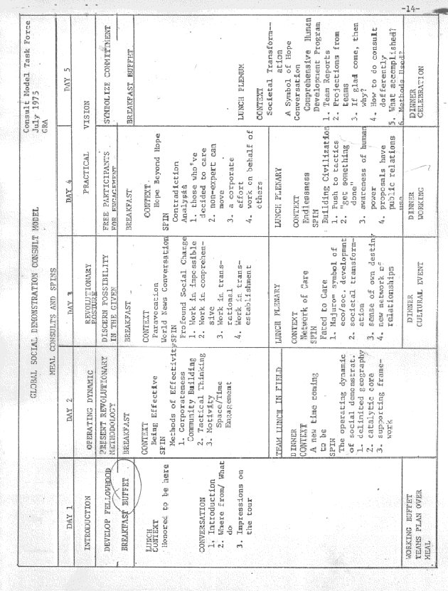 "WE HAVE ARRIVED AT AN HISTORICAL VANTAGE POINT WHERE THE WASTELAND ENDS AND HUMAN WHOLENESS AND FULFILLMENT BEGINS". REPORTS FROM VARIOUS TEAMS WITH REFLECTION AND QUESTIONS FROM THE WHOLE GROUP. FATED TO CAREBREAK INTO TEAMS TO BEGIN DISCERNING THE CONTRADICTIONS. CONTEXT CONTRADICTIONAL ANALYSIS (SEE PROCEDURES) |