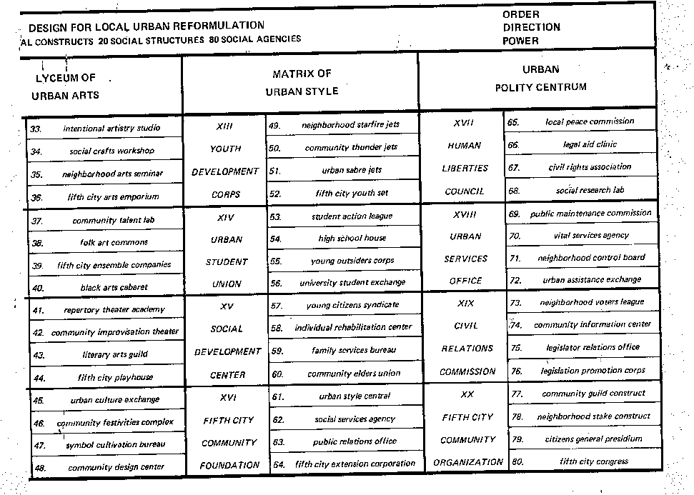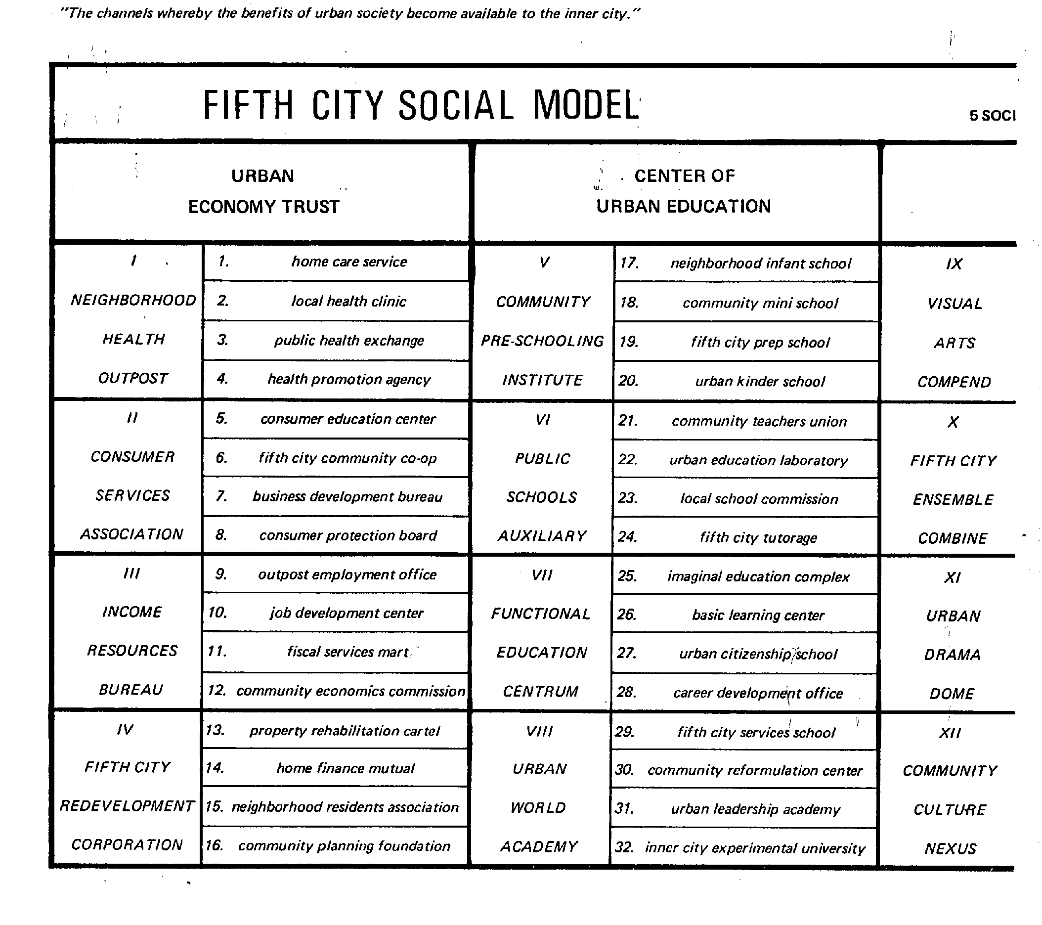 III. THE INCLUSIVE METHODS In the brief compass of this statement the indication of a practicai solution must be even more sketchy than the analysis of the fundamental problems. Inner city reformulation, it cannot be reiterated too frequently, is "comprehensiveness" in both scope and depth. The underlying problems relative to self-image, social constructs, and local power must be met in the broadest and deepest sense. In June, 1968, the Fifth City Community Reformulation effort completed its first fouryear experimental phase. During that time an impact and penetration has been made, ensuing in an awakening and commitment of a core of the citizenry. The imaginal education forms, the social constructs, and the community organization are established. The next four years of actualization hopefully will put the flesh and blood upon the experiment. The following is a description of this method of inclusiveness. 16 1. Imaginal education Reformulation of the black inner city rests upon imaginal education. This is where the attack must begin. It is the crucial problem of tine' ghetto. It involves, first of all, deprogramming the mindset described earlier as the victim image. Secondly, there must be a reprogramming with images of possibility, adequacy, and dignity. In brief, imaginal education endeavors to explode and expand the imagination to provide new tools whereby the individual can reconstruct an image of self significance in relation to his actual situation which will release his unique creativity into history. Imaginal education aims at motivating free, intelligent, responsible involvement in society. Such a process in the Negro ghetto involves the individual's becoming proud of his blackness and then moving on to grasp himself as a global individual participating in the formulation of the new world of tomorrow. It is a matter of being enabled to appropriate the limits, possibilities, and unrepeatable creativity of his own uniqueness. This educational endeavor must be an integral part of all formal structures of schooling in the community, and it must be undertaken through a multiplicity of extraformal means. It is imperative that imaginal education begin early. Schools must be created for the infant in the crib and continue until the first grade. It must be an essential part of public schooling and occupy a signal place in adult education curricula. It is a must in all senior citizen programs in the ghetto. Perhaps even the 17 ! l i extraformal approaches to reprogramming ghetto men are important. This has to do with the use of symbols described earlier. It is effected by their employment in a variety of situations through an almost unlimited variety of means including theatre, forums, assemblies, posters, community decor and the like. Imaginal education provides community motivation which is essential to the rebuilding of the inner city. It is fundamental to comprehensive community reformulation. 2. Social construct 1 Second to imaginal education in import is the creation of the "grassroot" social construct. This begins with an inclusive analysis of the human problems in the area, the constant problem being a lack of adequate structures. In Fifth City a problem mat was constructed which identified over six hundred surface problem areas and organized them under five rubrics: economic, political, education, arts, and life style. The next step was to bring into being a web of local social constructs to deal with the identified problems. Four such structures were created under each of the five major problem areas. Under the economic are the local Employment Out post, Community Redevelopment Corporation, Consumer Services Association, and Health Outpost. Under education there is a Preschooling Institute, a Public Schools Auxilliary, an Urban Citizenship School, and a Continuing Education Program. Similarly, four constructs exist under the political, style, and arts areas. This makes a total of twenty major local community structures. Each of these twenty has four projects under it, making a sum of eighty in the whole community. Finally, each of the eighty projects has at least four finelydesignated functions. 18 This complex is obviously crucial to the comprehensive reformulation method. These local structures are the channels whereby the benefits of urban society become available to the inner city. Here is the key to the local structures concept. They do not replace existing structures. They serve them. They make the broader machineries on the city, state, and federal level effective for the inner city citizen. For instance, the local health outpost uses the massive health facilities our total society has created. Or it brings them to the people and the people to them. It mediates between the broad public means and the local community. The same is true of the Redevelopment Corporation. This structure is a bridge between the great state and federal housing programs and the people for whom they were intended. One of the great tragedies is that the disadvantaged, do not even know about such programs let alone understand how to take advantage of them. Then there are the areas of education, culture, legal assistance, and endless other areas when you think comprehensively of humanness and the problems of the total man. Finally, these local structures give the people power to do something about what needs are not being met at all. This brings us to community organization.19