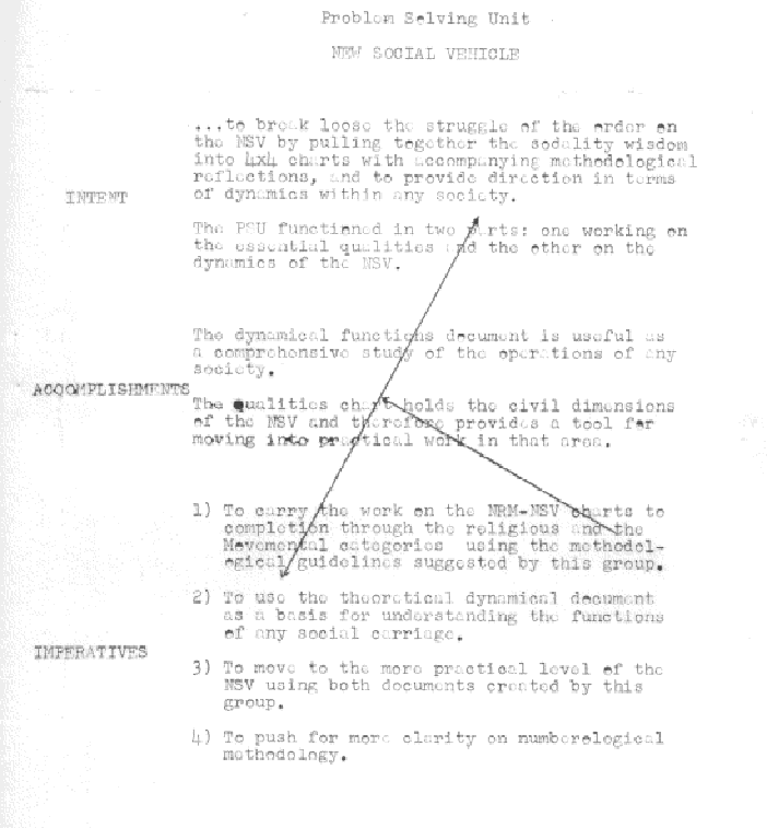 | The NSV is a social dynamic interrelated with the NRM which enables a human social ordering. It is totally comprehensive yet radically particular in it's relationship to every man. Where the NRM describes the internal ordering of humanness, the NSV formulates the external ordering of humanity. Where the Corporates describe what it means to be a maninsociety, the Civil structures of the NSV are the structural delineations of social corporateness. Where the Solitaries define the elements of man's depth as a solitary human being, the Religious structures of the NSV lay out the practical ways in which a man develops his own individual thrust in history, The Journeys of the NSV, are man's continua1 process of becoming. The Movemental dynamic of the NSV is man's practical means of creating society's continual becoming. Thus, the NSV is not a static model of an "ideal" society, but a structure of continual civilization on a global level in which every man selfconsciously participates.