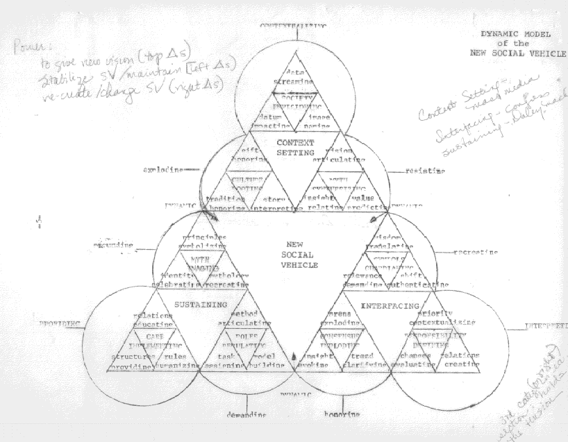 The dynamic of Myth Synthesizing is the tension that every social process experiences in articulating the manifest visions of society by relating particular insights and determining their value. The relationships of Myth Synthesizing are vision articulating which brings the new social vision into consciousness, insight relating which provides out of the present social context the particular grist for the new creation' and value predicting which is the constantly changing moral map or grid which undergird all shifts in the total context. |