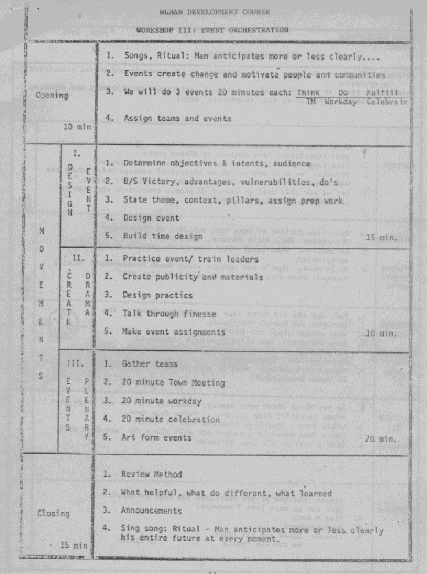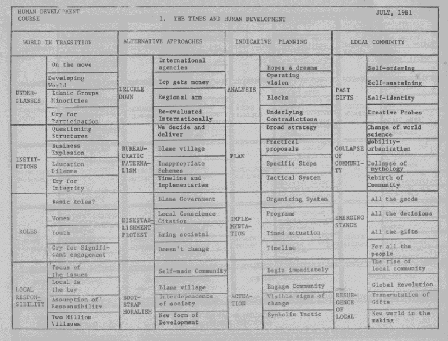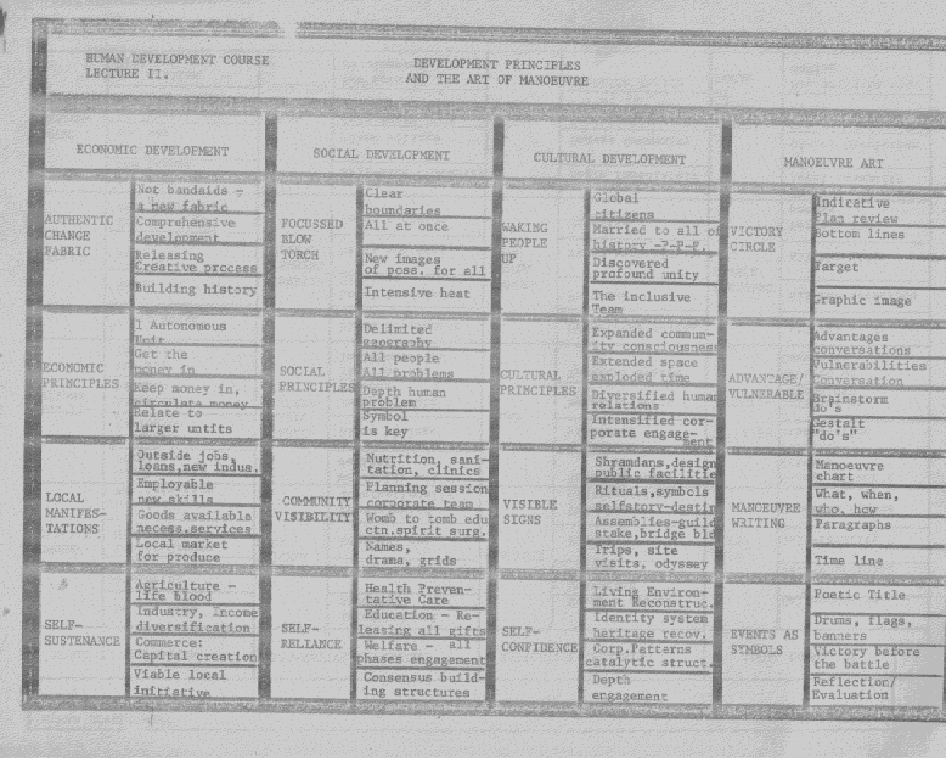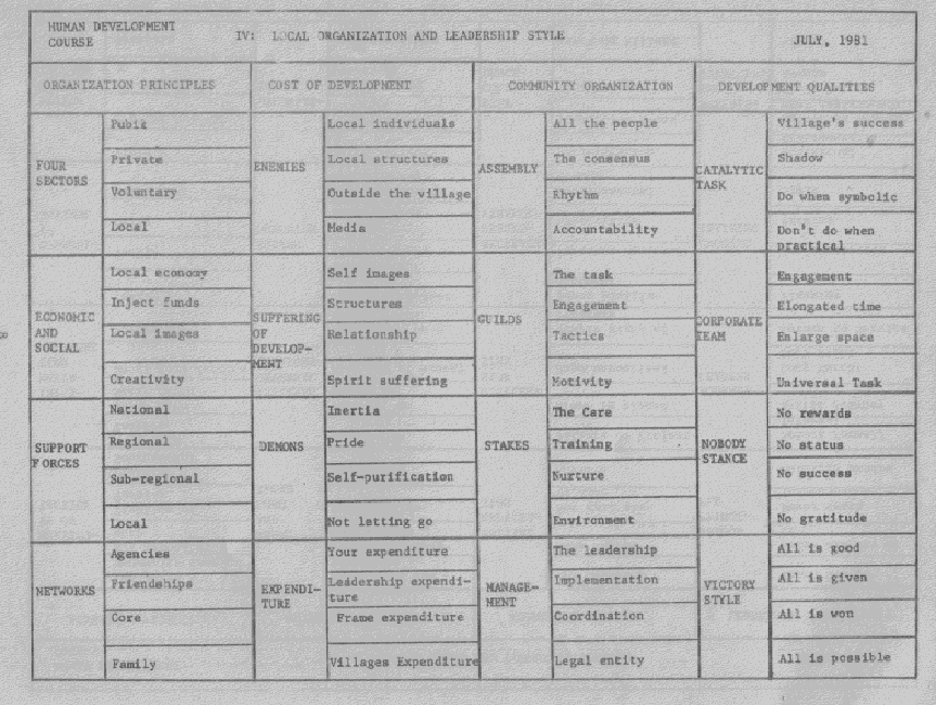 1. Once in a flood, people worked 20 to 22 hours a day for 3 days filling sand bags. In one harvest season my family worked from 3 a.m. to 10 or 11 p.m. for 2 weeks. When have you seen people work like this?2. What kinds of situations do people engage in like this, besides crisis?3. What is in these situations that allow people to work like this?4. What are the elements of this kind of engagement?5. How can a village engage the people fully in doing development?6. What would you have to do to have your community fully engaged? |