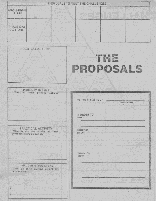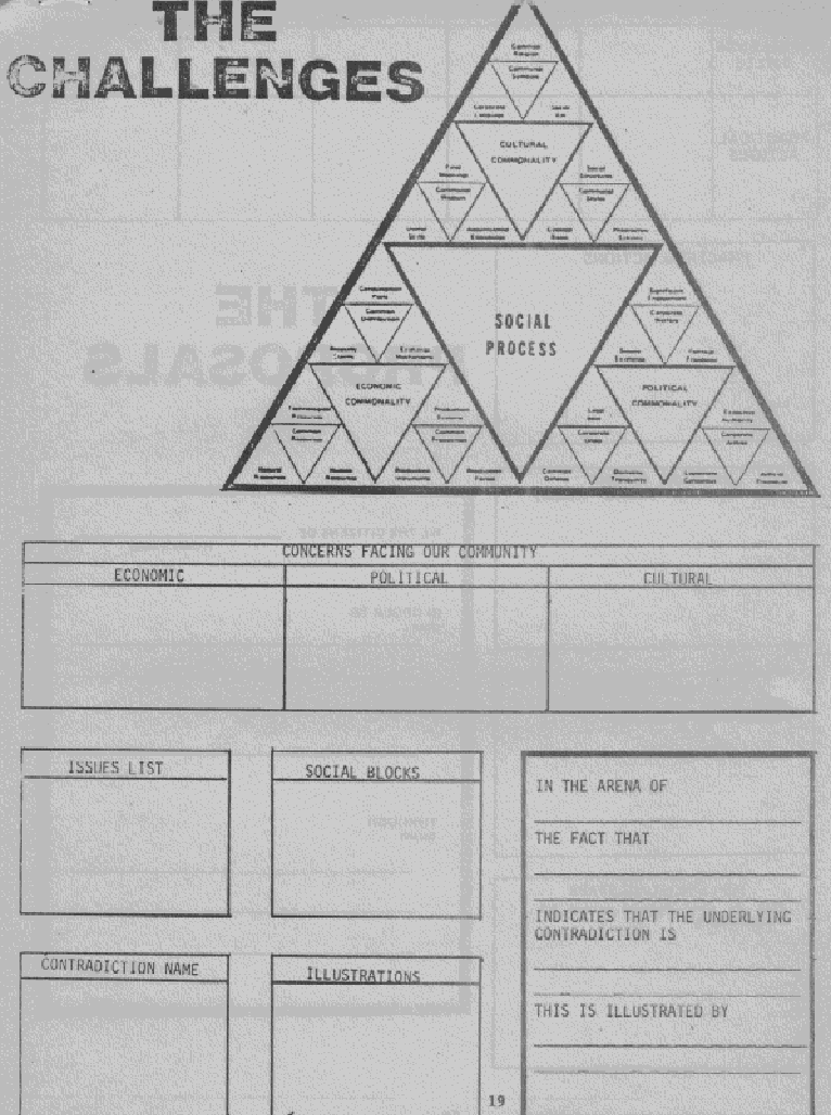 | 1. Present a drawing of some community. Point out the landmarks, housing, main roads, symbolic places, gathering places, shopping area, schools, recreation areas, garbage.2. What do you notice?3. Where would you add something?4. Where would you move something?5. How would you ease the traffic flow?6. How make the place more pleasant?7. What is the key to this living environment? |