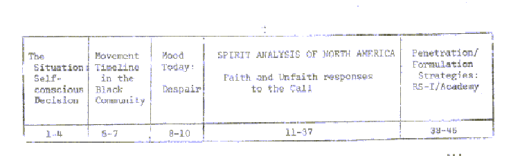 41. For the past two years the Urban Academy has served as the primary penetration dynamic, to catalyze the church in the black community. That has been accomplished or another way to say that is that the Institute is no longer finally identified as the Urban Academy. The Ecumenical Institute across the continent is now associated with RSI and with the local church, which is finally what we have been out to do. So, as a success the Urban Academy as a penetration tool has phased itself out of existence. Now we are going to continue the penetration trip as a penetration tool, and do that penetration in the local situation, in the metro and regional context of the movement, so that people grasp what it is they are about to participate in. On the accompanying chart is the journey of the Urban Academy: the places it was held, the number of people that participated in it, and the key accomplishment of that Academy. Using the image of penetration as the task of the Urban Academy, in 1970 we penetrated 65 people and in 1971 we penetrated 120 people. In the last penetration trip we had, we taught 300 black churchmen RSI in one quarter. It is that whirlwind now that we have to pick up on until this nation explodes with the possibility that is in it.