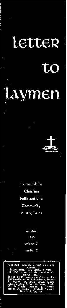 Campus ministers are coming alive to the great possibilities in their unique ministry. The Reverend Mr. John W. Wright, Jr. visited with the Community Collegium, bringing word from the campus ministry at the University of Florida, and talked of the beginning of a resident student program on that campus. In a forthcoming issue, Letter to Laymen will be sharing news of other creative student ministries about the United States.