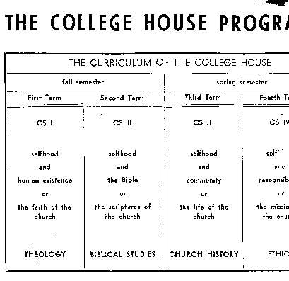 THE COLLEGE HOUSE IS ALSO COMMITTED to the principle of theological education of laymen which is intimately related to liberal education. It is concerned that every Christian be able to comprehend and express his faith as one v ho lives in the 20th Century and that he be able to relate his personal and communal experience and knowledge to his faith.