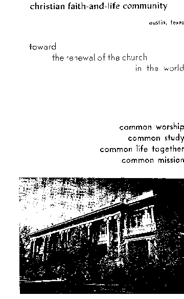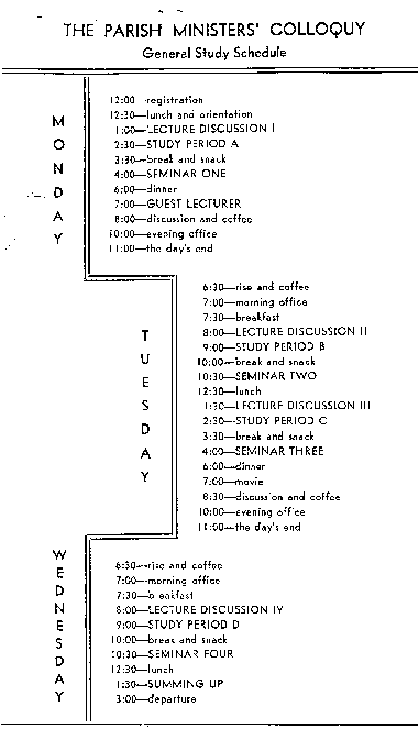 THE WHOLE COLLOQUY is a practical experiment in the direction of a new approach to group ministry. It is an effort to discover how, though separated by geography and specific tasks we may support each other in the wrestlings of spirit thought and strategy. The hope is that, by our common living and thinking and sharing we may arrive at new and very concrete possibilities for the life and mission in the local church and the ministry of the pastor to it, and thereby creatively contribute to the response that the whole Church of Jesus Christ is making to the mighty acts of God in our time.