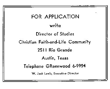 The colloquy will be held at the Christian Faithand-Life Community's Laos House at 700 West 19th Street which is the Old Wooten Mansion. The nicely appointed rooms and carefully prepared meals along with the atmosphere of the old house provide a pleasant setting for the discussions. Groups as small as 10 or as large as 40 can be comfortably accommodated.