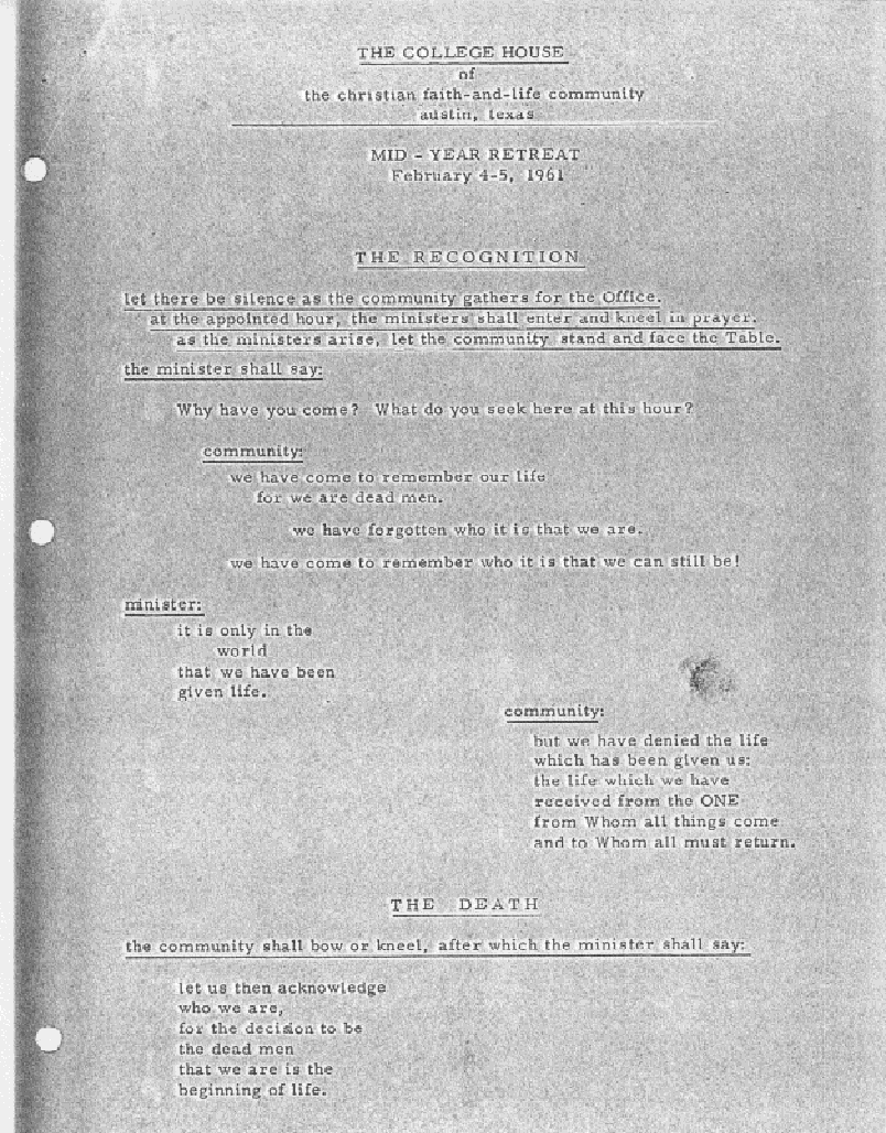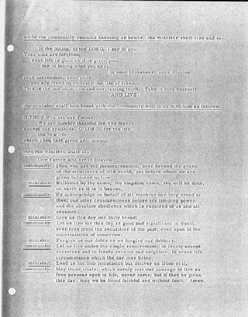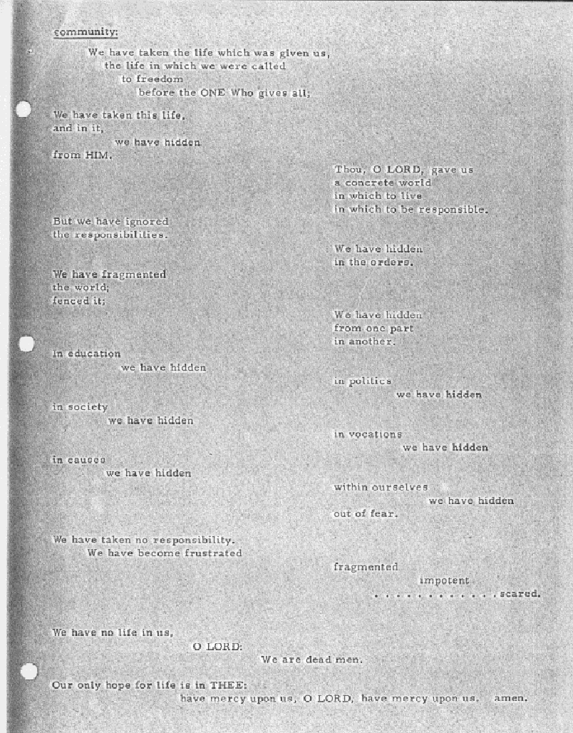 Community. AND UP ON ALL TIES OF LOVE WE ASK THY BLESSING. REMEMBER ESPECIALLY IN THY INFINITE' MERCY THE HOMELESS ONES AND EVERY FORSAKEN MAN.