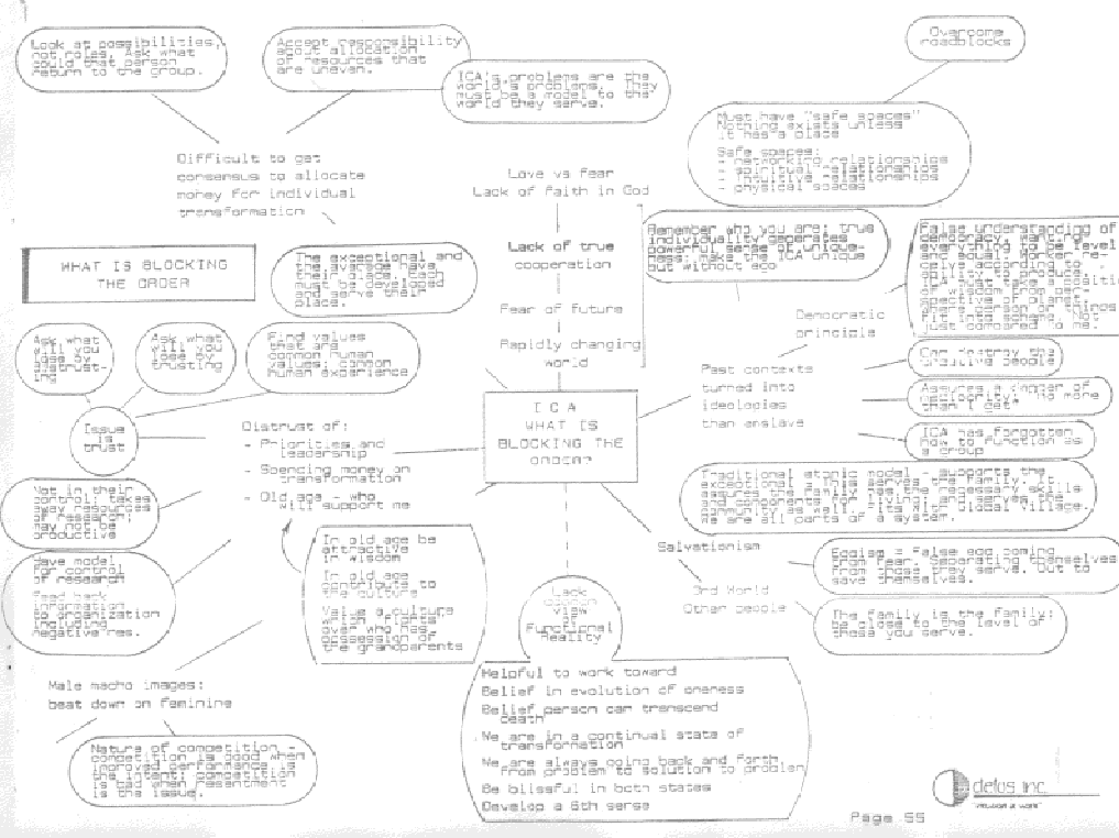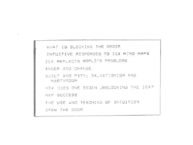Anger and hard feelings are byproducts of change. Change has to occur before new order. Ouring change all kinds of feelincs come to the s~urface. We see the ICA getting rid of personal frustrations that have been pressing for some time. Energy is shooting out of the planet, a tensionrelieving process. A similar process is occurring with the ICA. But we seem to be asking, what is blocking the old order? asking from an old age view. A better question might 'be, what is blocking the emergence of the new order? That is an interesting question.