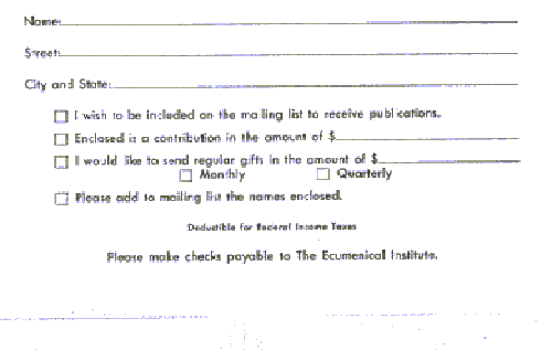 The Ecumenical Institute, born out of a resolution of the Second Assembly of the World Council of Churches held in Evanston in 1954, understands itself to be vitally related to the three overarching emphases that have characterized the Church in recent years: a theological resurgence in which the Church has been engaged in rethinking its comprehensive sellunderstanding and mission, the lay movement involving many experiments among the laity to embody their recovered mission in and to the world, and the movement of ecumenicity oriented in a fresh sense toward the mission of the Church at the most localized level.
