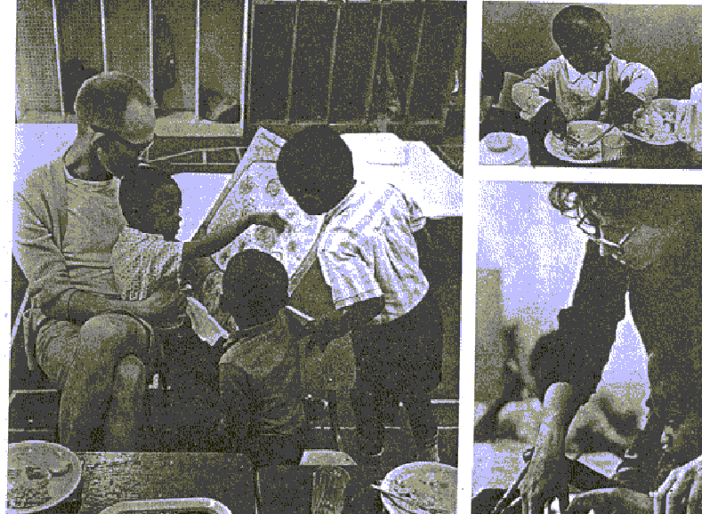 Mealtime is a feast, often the only real meal a child gets during the day. Carrying through on the selfhelp idea, the children set the tables, pass the dishes, clean up, sweep. The saying, or rather, shouting of grace is a joy to the ear and as modern as the Mass in English.