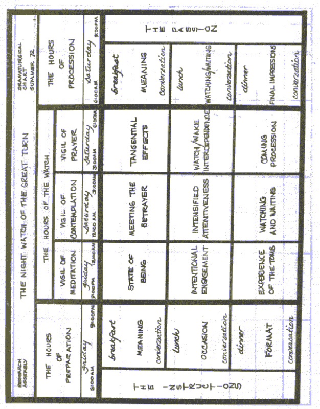 I. This is the summer of corporate discipline. We are experimenting with the wearing of the "yes as a sign of chastity. We would like to have a period of fasting/feasting to symbolize our corporate poverty, and celebrate the Movement's Great Turn with a grand ball. To rehearse our common engagement, we have been discussing the practice of the watch night service.
