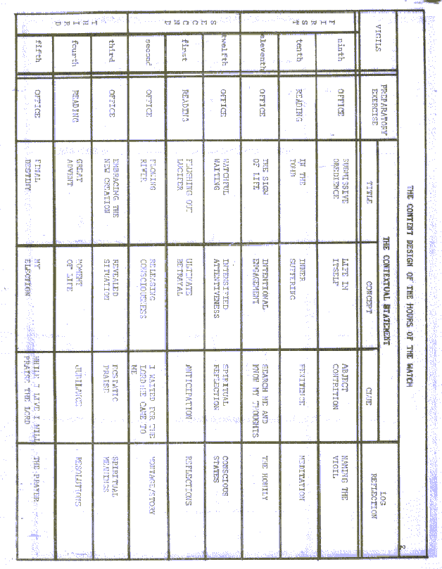 It is extremely important to create the categories of time in the night. By naming each vigil, one builds his journey and relates selfconsciously to the watch. Name each vigil sometime during the three hours. What name would you give to the vigil to start your reflection?