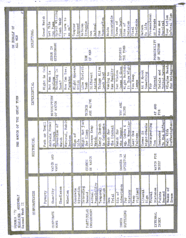 By means of fire, tools, and symbols, primitive man was able to keep watch at all times for natural dangers. But more than a practical use, the watch by the fire was for sheer fascination. The dancing flames and their capture was the symbol of the adventure that separated mankind from the beasts. Our contingency today is not in the natural dangers primarily, but in the historical vissisitudes. We watch historical phenomena. But the meaning is not apparent; there is more than the occurrence. We look deeply into life itself. We must watch for the spirit. This is our call to obedience. This is our adventure into new humanness. Tonight we watch for all of history. | |