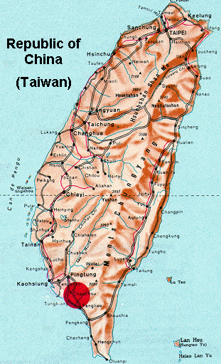 Kaohsiung stands today as the industrial hub of the province and has tremendous potential for leadership. The county of Ping Tung occupies the southernmost part of Taiwan and is one of the island's 16 provinces, south of Kaohsiung County. It has the unique feature of having mountains, fields and shoreline all meeting at the same place around the southern curve of the west coast. The same ancient migration that peopled the Philippines also brought the aboriginal peoples to Taiwan and they are now known as !'Shan Ti Jen" or the "Mountain People." These tribes and later arriving Hokienese or Taiwanese from Fukien make up Ping Tung's population of 850,000 people, situated in hardworking farming communities.