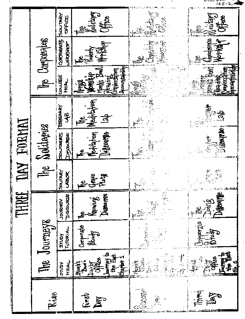 The profound function of the Basic Religious House Odyssey is to facil-itate a depth encounter with the self, the re-appropriation of the sacred to daily life. And the grounding of the sacred in human experience in order to intensify the human journey to new awareness and new responsibility for the globe. During the Odyssey the operations of consciousness are laid bare to examine the images and symbols out of which he lives, and to build new images and symbols which enable him to deal more effectively with impinging reality. As a participant today this journey he is re-acquainted with his own depth spirit experiences is enabled, through the use of the New Religious Mode Charts, to reappropriate those experiences as sanctified humanness (encounters with the Mystery. The Odyssey exposes man's eternal solitariness but allows that separation to be accepted and to release in him the ability to see each moment as possibility for covenanted relationship with self, Mystery and others. Through the Odyssey men are enabled to self-consciously appropriate the sanctity of every moment in their lives; they are freed to embody the Word.