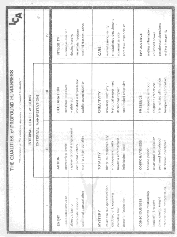 In our times, local man has turned from a theoretical or intellectual focus to a practical focus in doing or in engagement. Arising out of this comes a mythology which is profound. This mythology serves as a tool for local man, enabling him to engage in the building process. This mythology has been called the mythology of profound humanness which is a tool for local man to take every experience and reflect upon these, and push to their uniqueness and commonness. The mundane is taken and incorporated into local man's screen by use of the calendar. And finally, the materials or base elements for the mythology are the legends which came out of the environment local man shows up in.