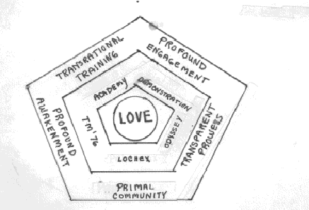 This is when hope appeareth. How do you find your way around this world, that is the other world, that is only present within this world? When I taught at Colgate, we were still talking about the wellrounded man, but people were pointing to the moral level of life. NO! When you push that to the profundity of the ontological, this pentagon is what it now means to round out your existence. When you walk around that pentagon and come back to primal community, then you know what primal community is.