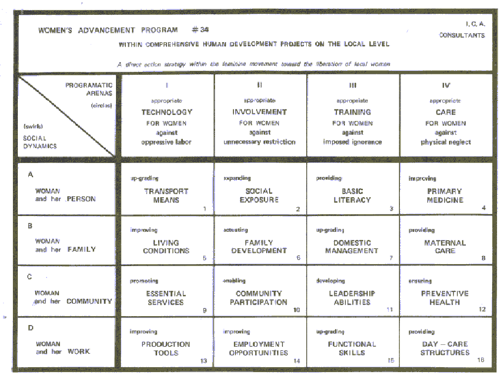 10. It is evident in any feasibility checlc that the model is being field tested for more extensive use. Upon completion of the feasibility phase of the two concurrent women's programs' the ICA will be in a position to design a long range plan available for mass use immediately. Impossible as this may seem, the eventual target can be nothing less than the 900,000,000 women who make up the poorest of the poor. This planning will take place after the sixth month evaluation of the project. Several possibilities which could be further developed at that time are: first, tile development of means to increase the effectivity and speed of making the Global Women's Forum available on a massive scale. This would involve a combination of training additional women staff, rapid upgrading of women staff on location where the ICA is currently operating and increasing the capability of the women consultants in varioi~s nations. Second, the Global Women's Forum could be made available to public and private agencies with a similar concern. This would make it possible to offer the program in locations where the ICA is not presently located. Third, the Women's Advancement Program can be expanded rapidly by its integration into the replication plans for the 19 different natlons where 36 Human Development Projects are current7y underway. For instance, in India alone, 250 such comprehensive village projects are to be initiated in 1978. Fourth, focusing Global Women's Forum on the urban educated women wili enable the national development effort by training concerned women