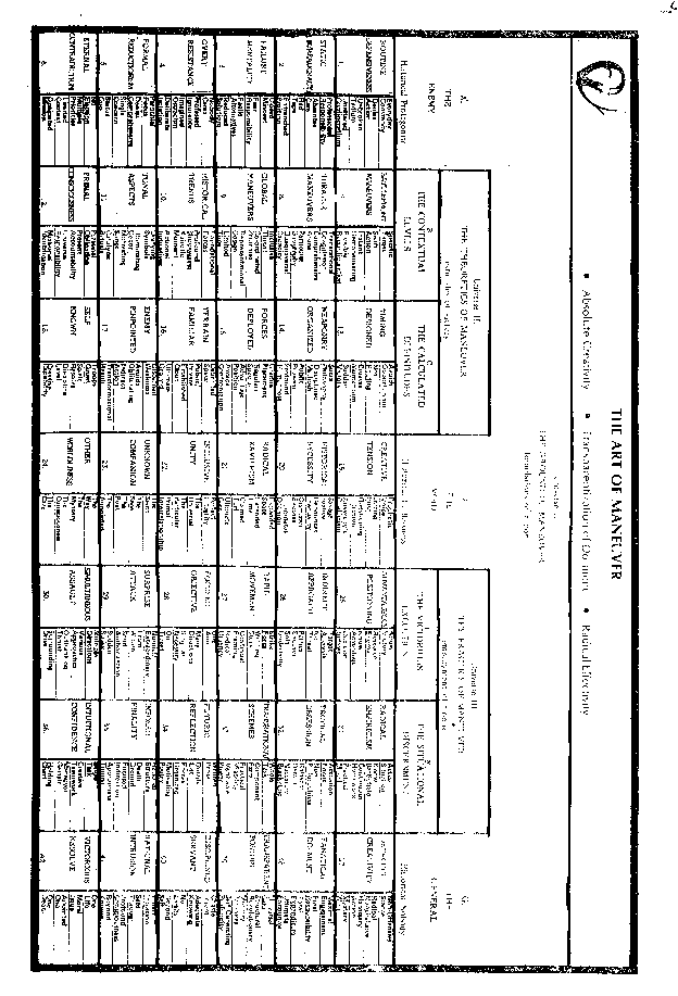 The general is the historical nobody who guides the particular situation to victory, birthing history in response to the Void and in utter detach ment to all but the resolve to serve creation. The general never resorts to self-justification, apology or self defense for he has no personal reputation to maintain; with nonchalant detachment at the heart of his profound care, he determines the necessary action, performs it, and offers it up to the mystery. Always positioned at the center of battle where the demand for engagement is maximal, and knowing that he alone bears final responsibility, the general wrests possibility from every situation, never saving himself, his energy or his power from the total expenditure required to meet victoriously the presept encounter which, for him, is always the ultimate one. Grounded in radical care for the whole world and all of time, the general acts inclusively to transform particular social structures, grasping his action as the human response to life's Mystery, and continually creating occasions which call him to plumb the transparency present in the mundane. The general is chaste to the one task to which he has given his life, embracing all that he knows as adequate for performing the radically free act, acknowledging no limits upon his decision to win, and standing prepared at any moment to wrestle with the impossible and claim its transformation which he has helped tobirth, but which finally belongs to the Mystery alone. Trusting his intuition as the key to perceiving the complexity of any historical moment as simplicity and form, the general sees through every situation to its deeps, i.n profound awareness of the ultimate dynamics of his own depth encounter with the Other, and of its significance beyond what he will ever rationally know. The general takes his one life and wills its expenditure in the effort to resolve the moral issue of his time, recognizing that he has been chosen to fearlessly give his one death, his last weapon against the enemy.