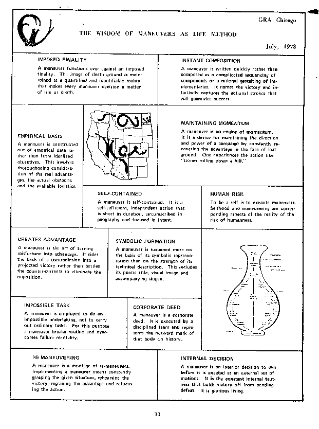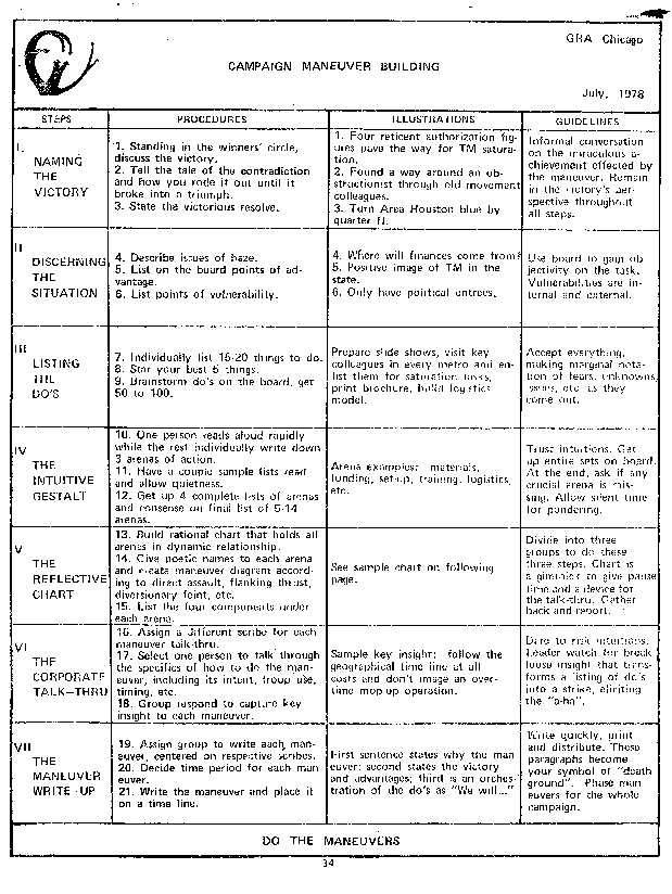 The following steps are recommended for maneuvering or remaneuvering for short strikes on the battlefield. This planning can be done in 30 minutes: 1. Rehearse the decision to win, remembering the cruciality of the victory and its projected effects. 2. Weigh up the current situation including advantages, vulnerabilities, point of blockage, timing, terrain and troop issues. 3. List the do's, including surprise actions, indirect thrusts, sneak attacks, troop shifts, geographical reconfigurations. 4. Talk through the maneuver with team colleague until the breakthrough action is discerned. Take a break if necessary to get the "aha". 5. Do brief writeup and a poetic title to hold the maneuver. 6. Move out immediately to accomplish the maneuver. |