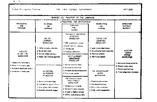 The intent of the six showcase maneuver is to create, with the completion of the six present projects, a dramatic demonstration of what is possible in such a way that we will move to launch the 12 with the strength of a credible record. This involves primarily stating and exacting the definitudes of completion. First, we will create an image of phases toward completion. Each project will study the document epilogue and plan how to realize this vision in social and economic substance by June 30. This will involve putting objective content on our presupposition related to tripling the income of these six communities, transforming the physical space and transferring the leadership from the auxiliary to an iron core of trained people. In addition, we will create a design to powerfully dramatize the shift to completion, including looking at the role and function of acceleration treks over the next four months. |