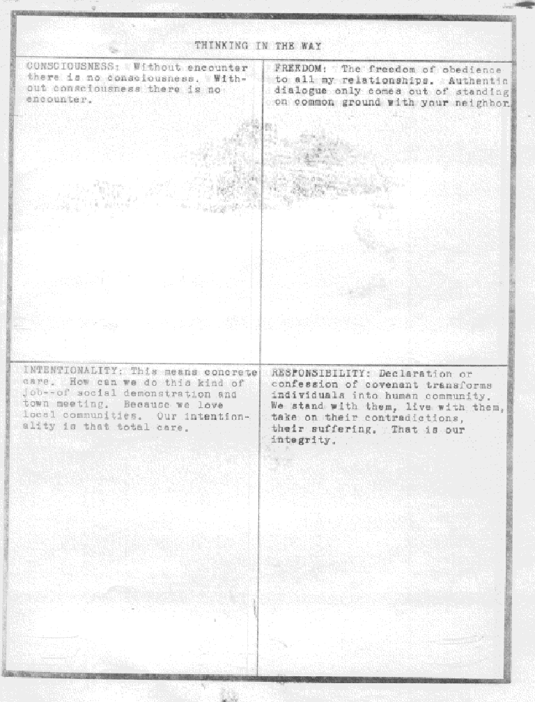 This summer we are intending in both our research task forces and in our "spirit life" to fix our attention on the life of the Way. For once these two aspects of the assembly are one. For when you push beneath the surface of the happenings in Town Meetings and Assemblies and Demonstration projects, what you reach is - and we're not good yet at identifying or measuring it- far better at doing it - the human factor, or the life of the Way. And conversely when you begin to spell out the implications of the finality, thinking, acting and presence of the Way, what you get is primal community - the Human Factor.
