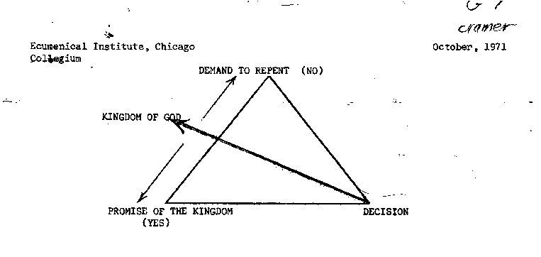 9. We have to see finally that Jesus is not out to wipe out or to prop up either of these groups. Rather his proclamation, his word to them is that neither of them have even the slightest possibility to live save they make a new decision , save they decided to live as the outcast or to live as those who would rather have life wrapped up. You can see from the diagram on the first page that in the pressure chamber, in the synapse between the demand to repent and the promise of the kingdom, a decision is called for. It is the decision to embrace both the demand and the promise that thrusts one into the kingdom of God. Gogarten says that these two; the call for repentance and the promise of the kingdom are "interdependent.'' They are the "No" and the "Yes" which when heard free a person to make a new decision. Jesus demands that all men, both groups, step out of their pictures of the world. Either those who are the establishment or those who see themselves to be the dis­establishment must step out into the uncertainty required by a new decision. For Jesus the man who decides to live in the uncertainty of the future, in the midst of the actual ambiguity that life is, then has the possibility to make an authentic response to life. Jesus tells the story of the Samaritan who made a direct response to the demands placed upon him in a living event. That decision of the Samaritan enabled Jesus to say that this is what it means to be a neighbor, an example of an authentic life. For Gogarten there is no possibility of turning away from "this world," save you move into the world of uncertainty, make the leap into the unknown, respond to a new situation which then gives you permission to make a new life decision and forge out history in a brand new way. It is in that decision, to live in the uncertainty of the present, that you see the living out of the creative word of god."