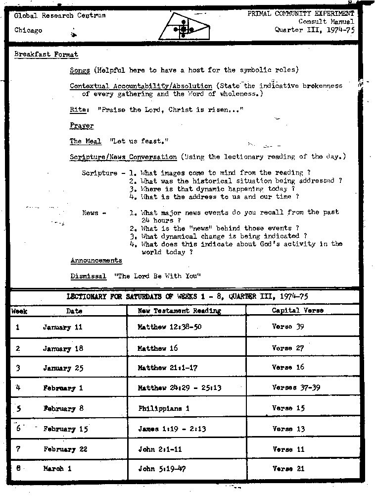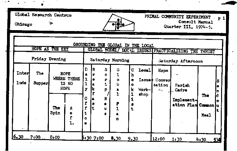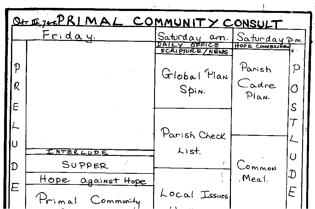 2. What insights havebroken loose this weekend ? about being a Parish Cadre ? new data relative to primal community ? the global significance of what we have done ?
