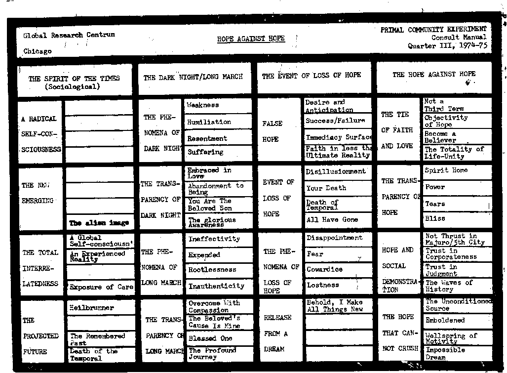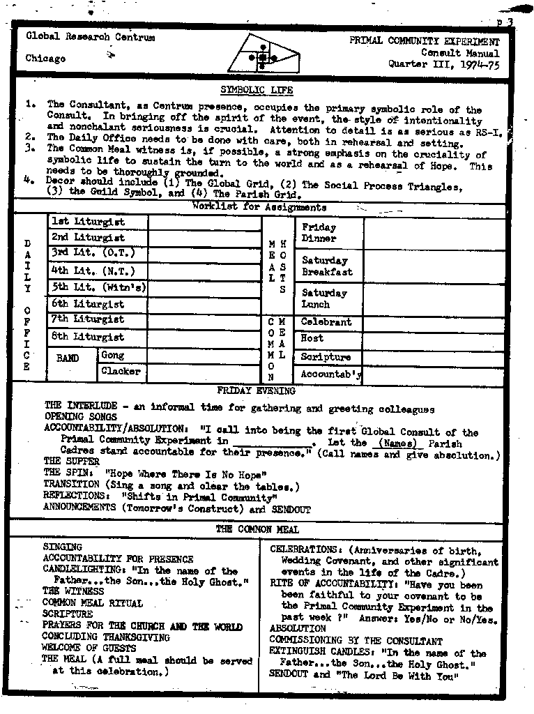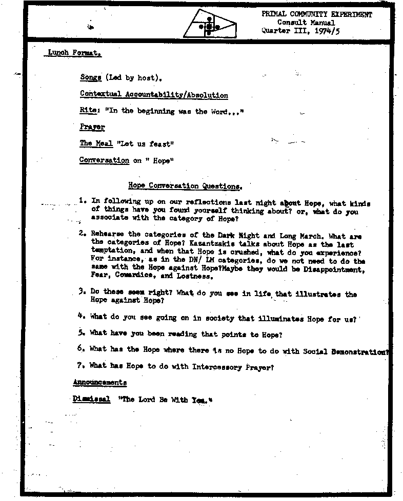 The apirit rubric a deal with the apirit edge of a~nk~nd, "Hope Wbere There Ia No Hope" Xe' to the Conault it la dealt wilb in the Friday evening apin and re n ectiona, tbe Breakteat Sarlpture /Newa convorastion, and tho lunah oonveroation. The Co~mon Meal providoa the high oolobration at tho close of & turdag afternoon.