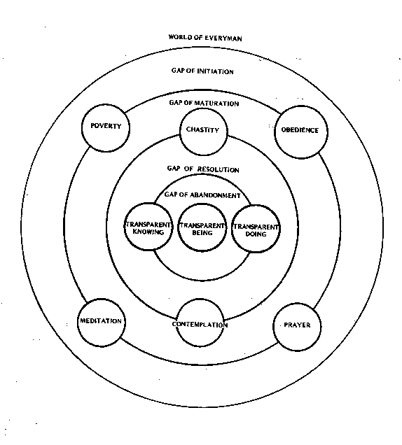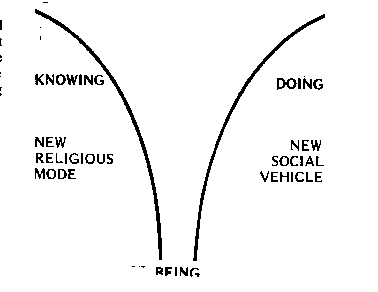 When they forced me, I went to the board and drew this figure (see diagram). We had dwelt on the knowing side in deeps that shuddered the fibers of our souls, and we had participated in the doing side with the same kind of frightening intensity. Then we had seen the relationship between these two, and just when we had the universe wrapped up, it blew from the bottom! And we were in nothing. This knowing and doing were no longer meaningful to me. The bottom had blown, and in that blowing we had a vision of being, of what it meant not only to know your know and to do your do but finally to be your be.