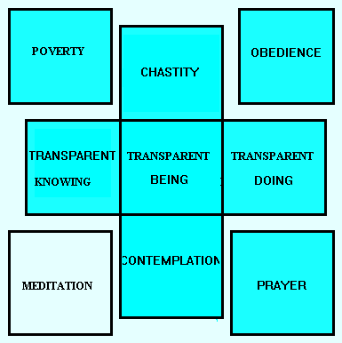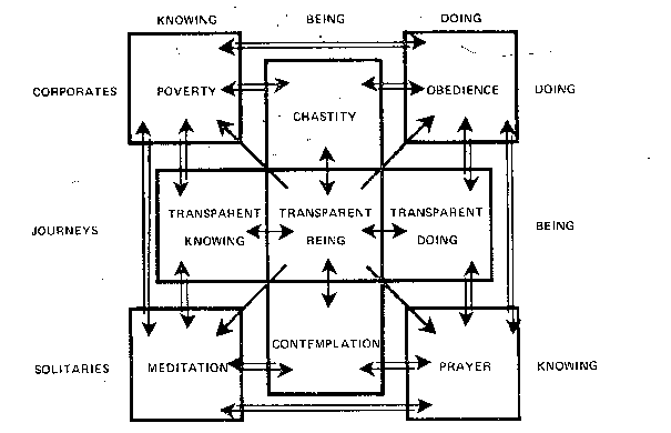 Here are the charts: this is poverty, chastity, and obedience. This is meditation, contemplation, and prayer. And this is transparent kknowing, transparent kbeing (you have to say it a little hit differently here because you don't mean what most people mean when they use the words know, be, and do; for us they are under the rubric of the intensification of knowing) and this is transparent k-doing. Now the interrelationship of these is tremendously important. You have to draw arrows as are shown in the diagram. This is a dynamic construct and not a static one. If you are to know what you mean by prayer, you have to see its relationship to contemplation and meditation and also its relationship to obedience and to doing.