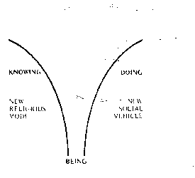 Those of you who are familiar with some of the graphics of our group know that we began with the knowing pole, which shoved us into the doing pole. Then the bottom broke loose, and that drove us into the being pole of life Now being does not exist. Someone said to me the other day that a halo over any spirit man was a brass hero. I like that very much. That is, a spirit man doesn't exist. He is sheer presence, if you please. His being does not exist: there is nothing there. It becomes pretty clear that being is an intensification of knowing or being is knowing become transparent And being is the intensification of doing, or it's when doing becomes - utterly transparent Having been shoved into the being pole, we began to try to grasp what the intensification of knowing is And in our opinion, this illustration shows what the intensification of knowing is.