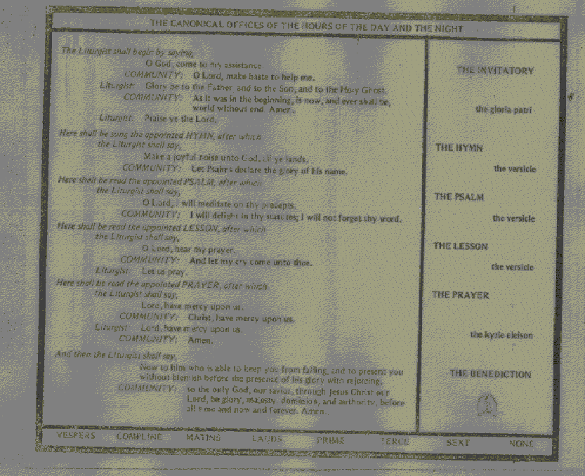 This experiment in a new form of the Breviary is one attempt to recover spiritual meaning in our time. Post modern man as man in the past must have a way of internally marking the times of the day. It is his means of being present to his significance. and hence of internally sustaining himself. This becomes more important as life continually grows more complex. The aim of this Breviary is to contribute to this need. Its intent is to recapture the rich heritage of spiritual nurture found in the Canonical Hours while at the same time to transpose them into the milieu of the post modern world.