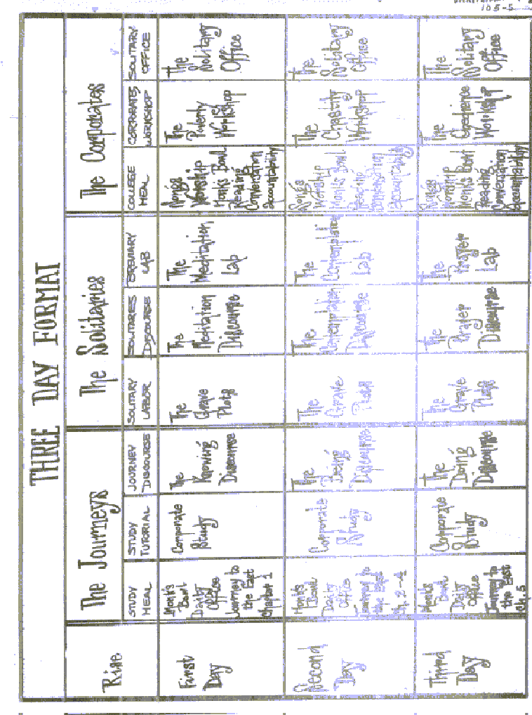 | Page 1 2 3 4 5 6 7 8 9 10 1112 13 14 15 16 17 18 19 20 21 22 23 2425 2697 2825 | Table of Contents Profound Function Rational Objective Existential Aim Three Day Format Feast of Beginnings Feast of Closing Feast of Beginnings Chart Basic Time Design The College Format The Readings Journey to the East Chart Journey to the East Day I Journey to the East Day II Journey to the East Day III The Solitary Office Procedures Rubrics Readings Day I Readings Day II Readings Day III The Charts and the Labs Knowing Exposition Sentences Knowing Lab Meditation Exposition Sentences |