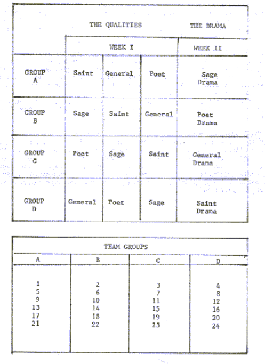 In Week I, each team will articulate its insights on three of the four Exemplars. In Week II, the remaining Exemplar will be put into a dramatic oneact play to be presented in the final Roundtable Celebration.