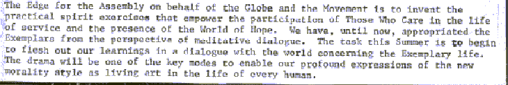'Ii~e liJ3(1 (;lol~al .tesearc.l ~\ssel~i7~1y occurs at a i~rofounclly .significant `~or.leTIt :in t,~e Litc ai.l~L ~:c\rl; c~t '~ile :[r~~tit:u;i.e. It stanas as t.~e first oi severa.L sur.mers \`rilose focus ~.'lll `'n u[>on tile tash of ,.'.OV;.'T ~ellta.L r~orr;.atio:~. 't'ile e:,lergence o f pt'O?L e tlilO care across t~le ,,lo :;e cails for creatiug tne prac:tical for~s of engaging and sustainin., tilose .~no !~ave ass ur.:ed tile tas'i of awal;enin,~ tne f~lur billion ``eople o F t.le planet. t;es~inniny in tue 1971 Global ~esearci~ .\sseT.~uly, `.;e develo ~ed tne tileoretical .Jasls for tne t~:enty,~ear task of c.ltaLyzin~ a ne~; 'social vf~nicle." P,ased upon t!,e concensus of more tilan .L.)~)') r~ro~s'rar~ participants from all walks of life and from Trany garts ot tne globe, tl~e dyTIamical relations Ot tile soci.al processes of lluTT`.an ez;istence :,ere spelled out, ti~e current ir~Tualances artic~.tlatecl, tile [>ro.lTouncl conteTnporary ideoloS,~ical posture declarec1 an`1 a system of practical proposals created to~;arci t.le l~ractical vision of tnis new ';social vehicle. " In t}le 1')7~ C,loual T'esearcil Asser~bly, tilis ~!orl; w~ls carrie<1 to tile tactical level, resultin,~ in