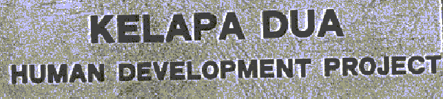 and infant levels, as well as informal educational events after school. Finally, the community would like to see greater opportunities for advanced education made available to them. The people of Kelapa Dua see that the future of their village requires a conscious development of community style in terms of community facilities and identity. They are anxious to establish recreational areas for children and youth, especially a sports field. Areas for social gatherings would facilitate expression of community pride and cooperation. Villagers also saw improved housing as important to the overall design of the village. In addition to constructing such facilities, the Consult discerned a longing to develop ways to strengthen the local identity of Kelapa Dual Community work projects are a part of the heritage of Kelapa Dual The villagers hope to structure this cooperation and extend it to local councils. They also hope to establish social care like a security system, local visiting and an orphanage. A key to community identity was seen to be leadership development; people want better intervillage communication, skills in entrepreneurship and liaison with the local government. Kelapa Dua residents desire ways to celebrate their identity through telling traditional and modern stories, using symbols to mark the community and singing local songs. Overall there is a longing in Kelapa Dua for a new cooperative spirit. | |