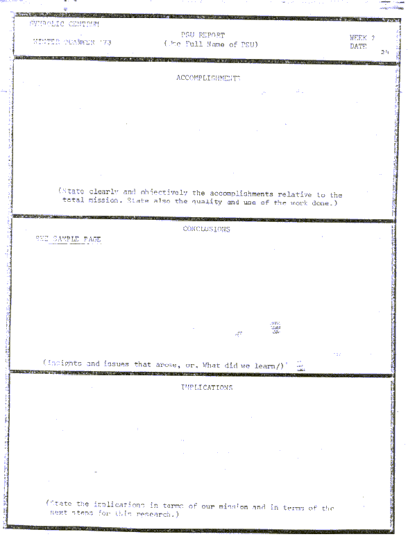 2. FORMAT Next sketch in 35 word phrases the flow of problem solving across the 5 sessions of the weekend. This includes the orientation of the group, evaluation, typing, printing, collating of the product and distributing of the PSU product and report at the end of the Week II.